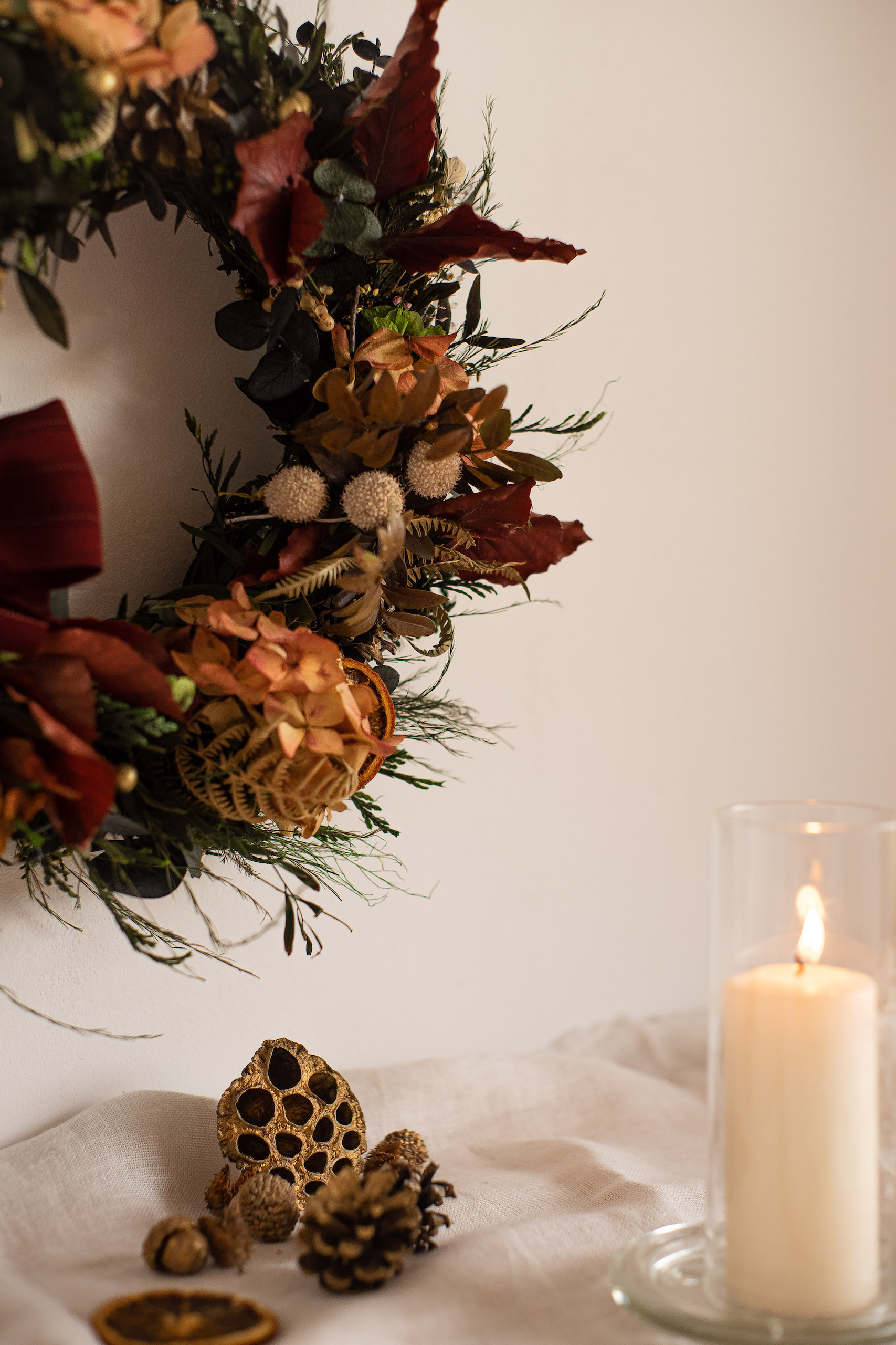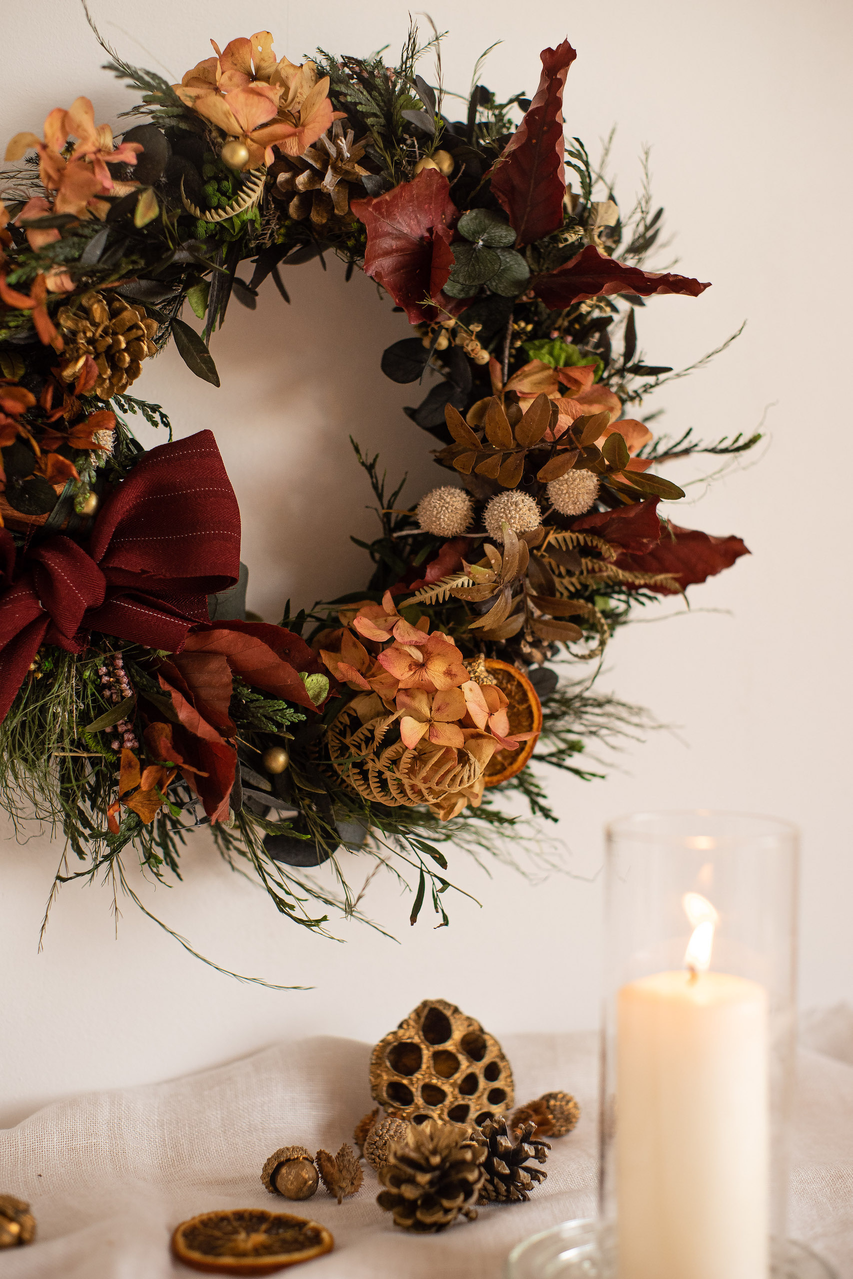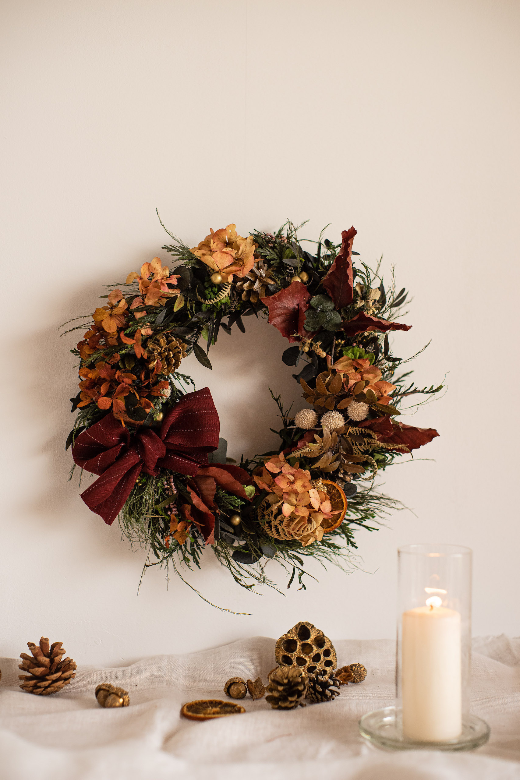 Cada corona esta feta a partir de cada comanda, artesanalment. La forma i el color poden variar depenent de les fulles i flors, ja que és un producte natural i mai és igual. S’entrega en caixa de cartró, embolicada amb paper de seda.