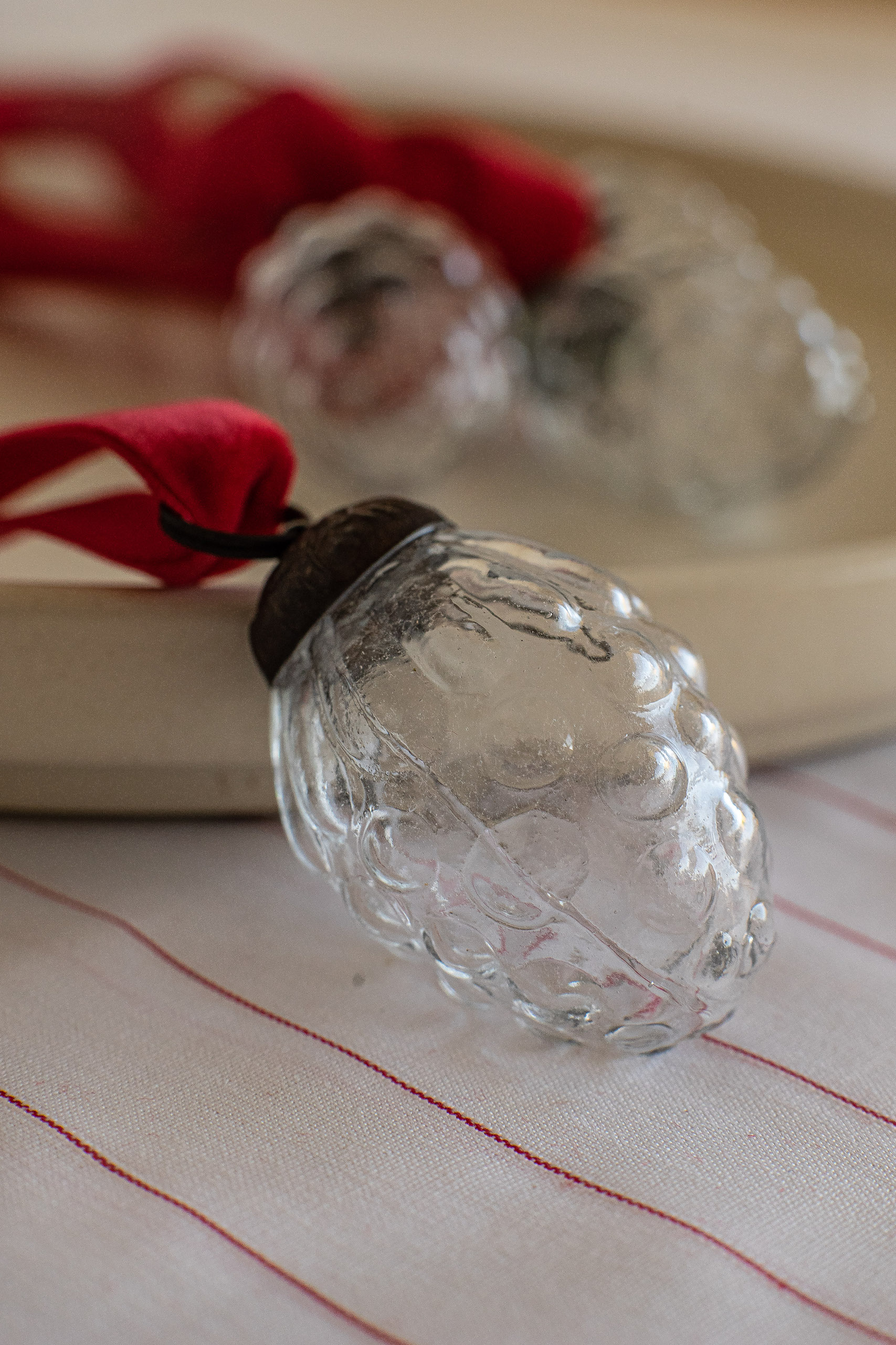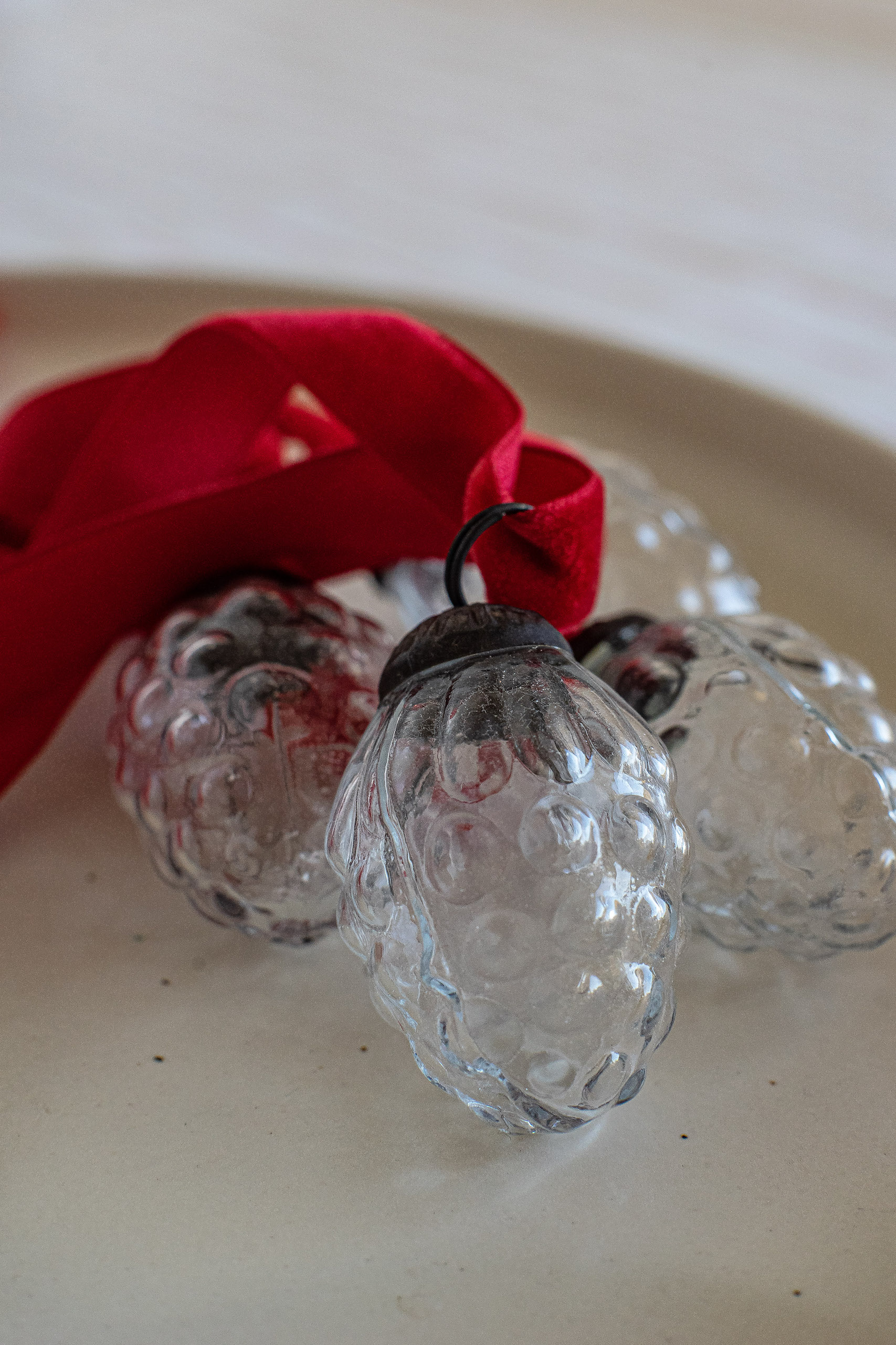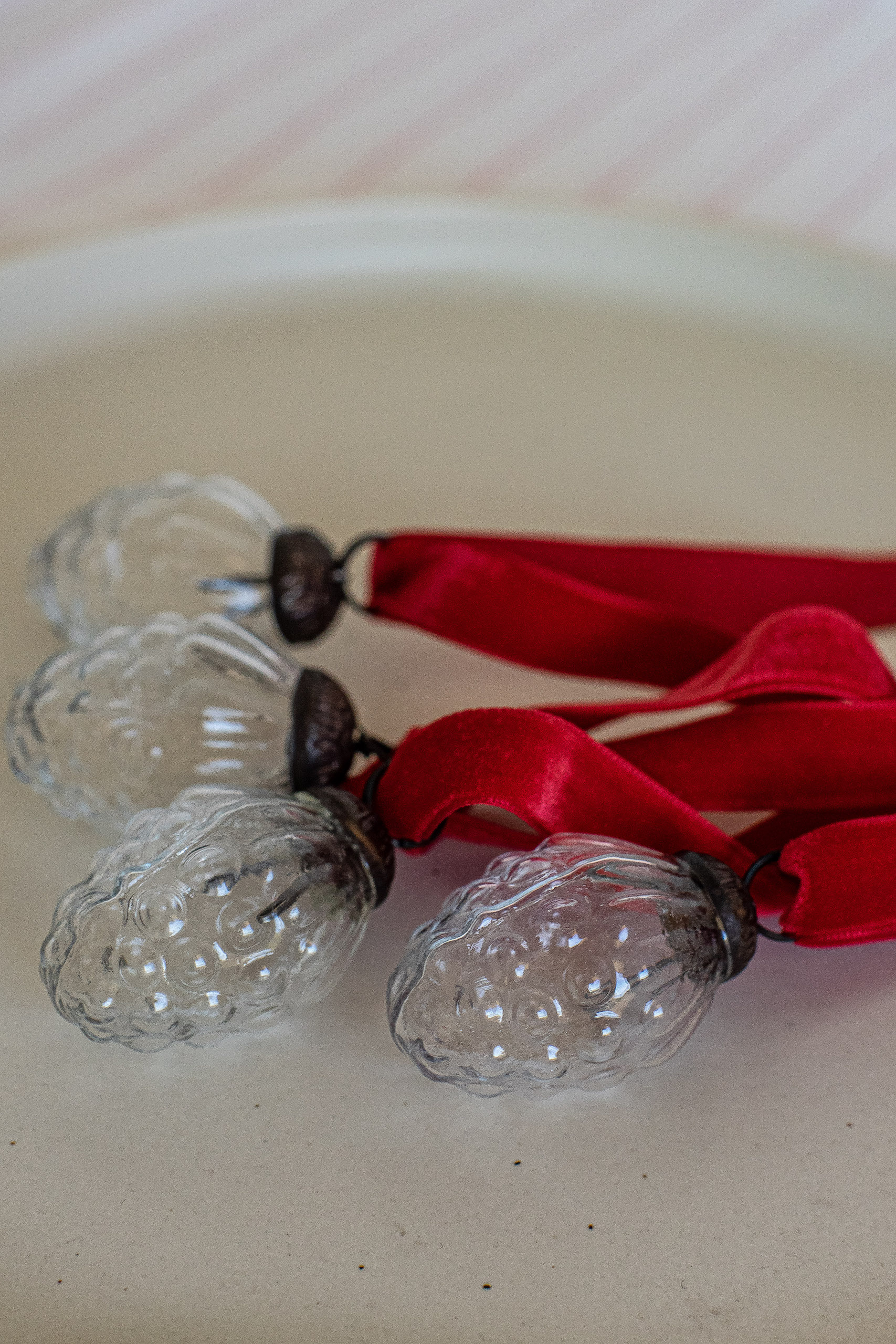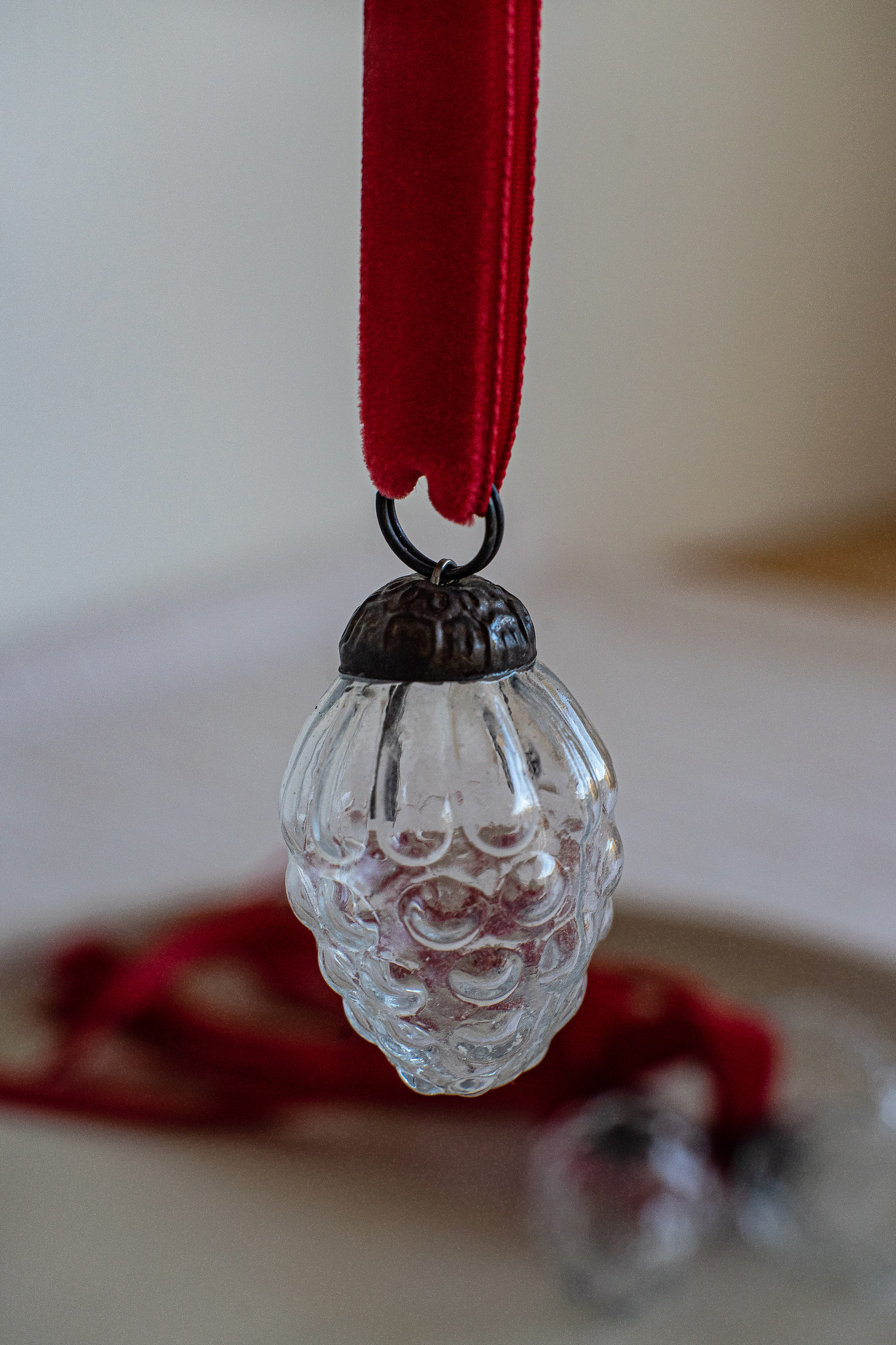 Paquet d’ornaments de vidre per a l’arbre de Nadal, en forma bola allargada .Tenen cinta de vellut per penjar-los.