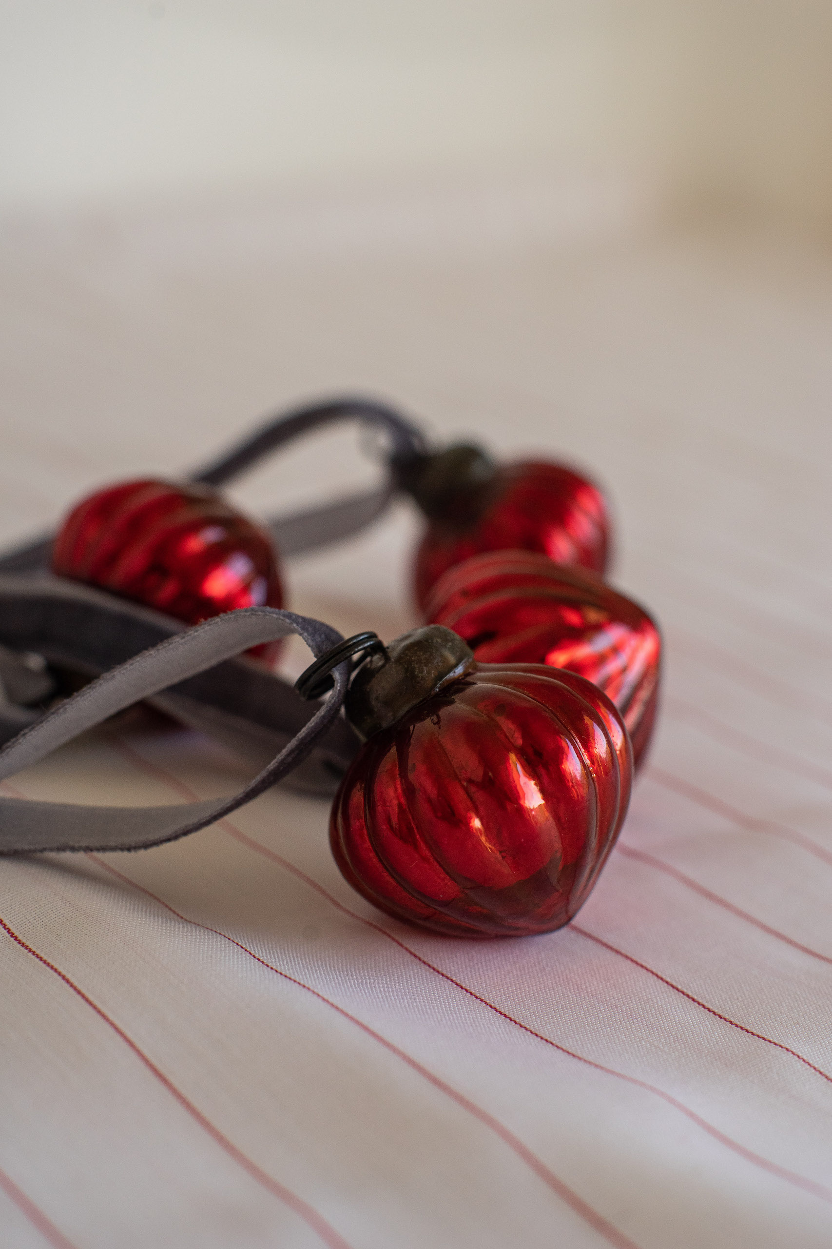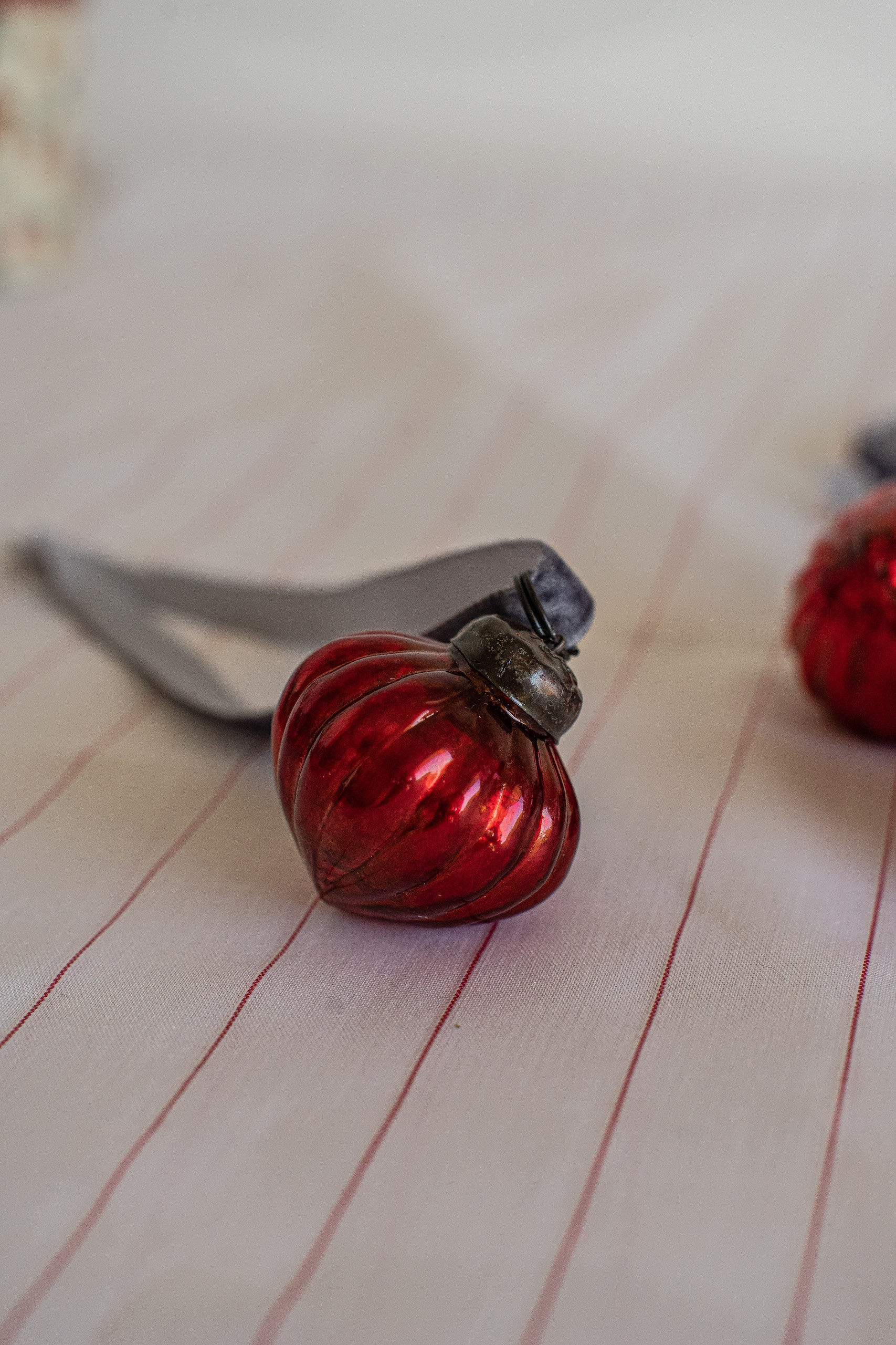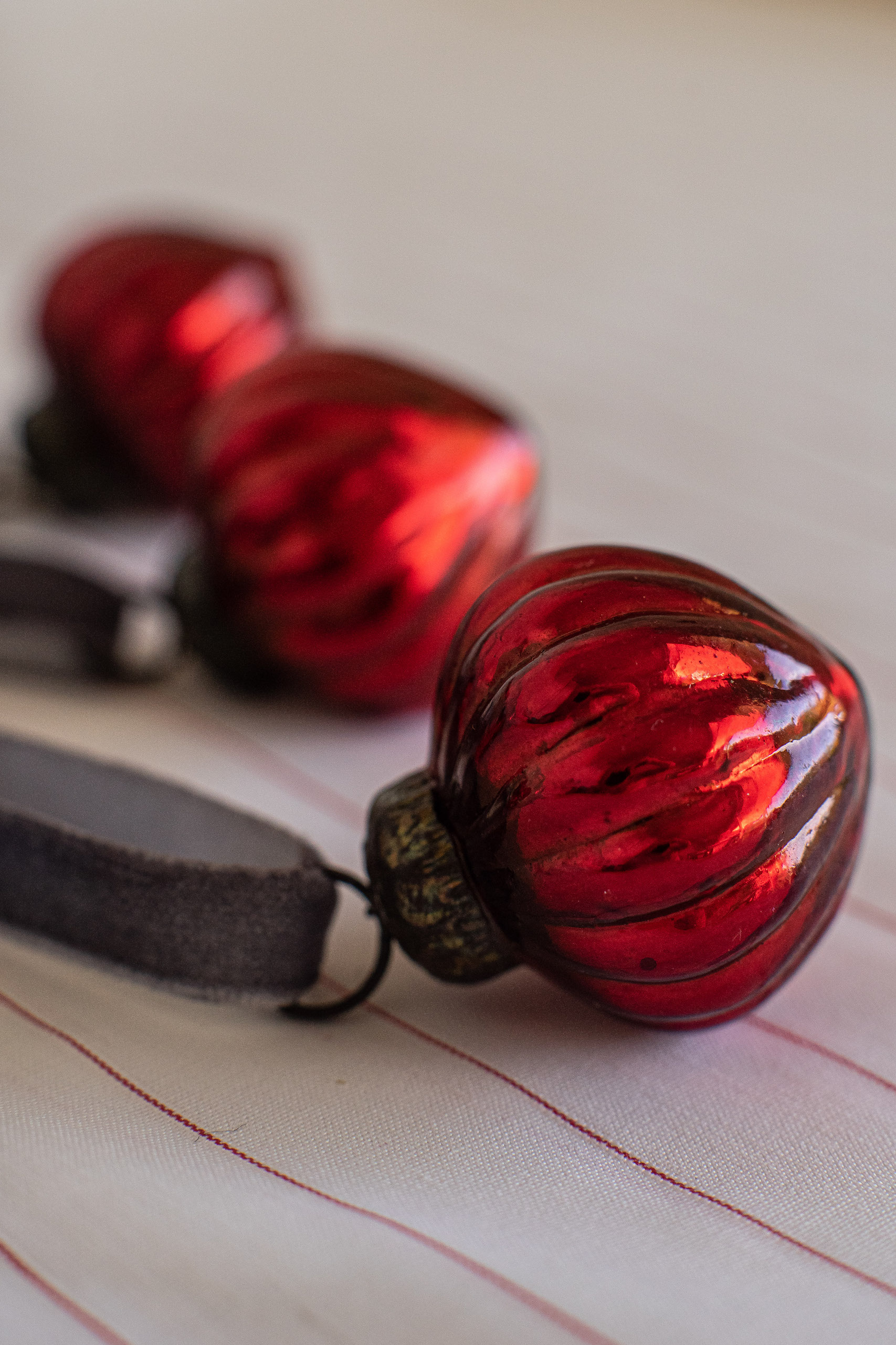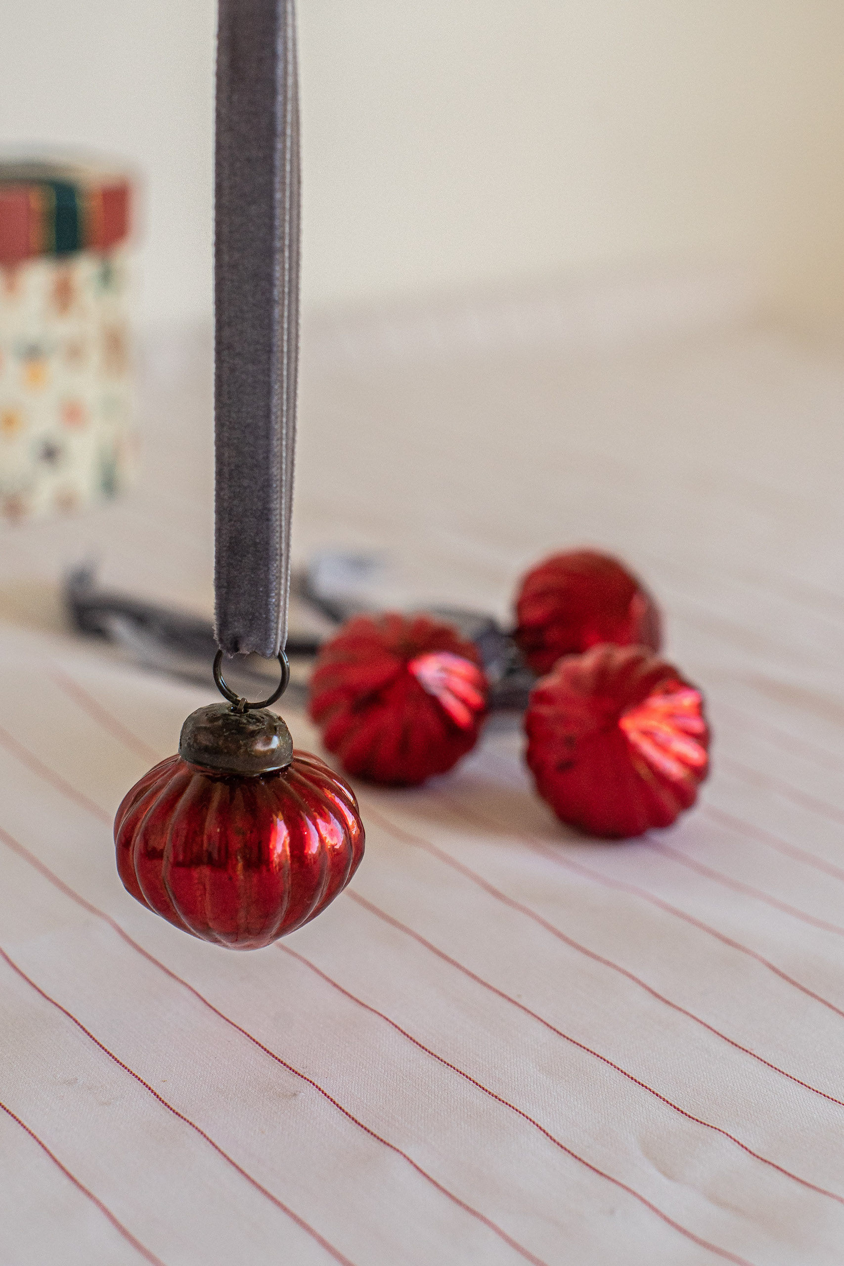 Paquet d’ornaments de vidre per a l’arbre de Nadal, en forma gota ratllada .Tenen cinta de vellut per penjar-los.